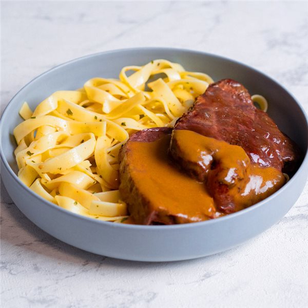 Meloso de ternera en salsa thai con tallarines
