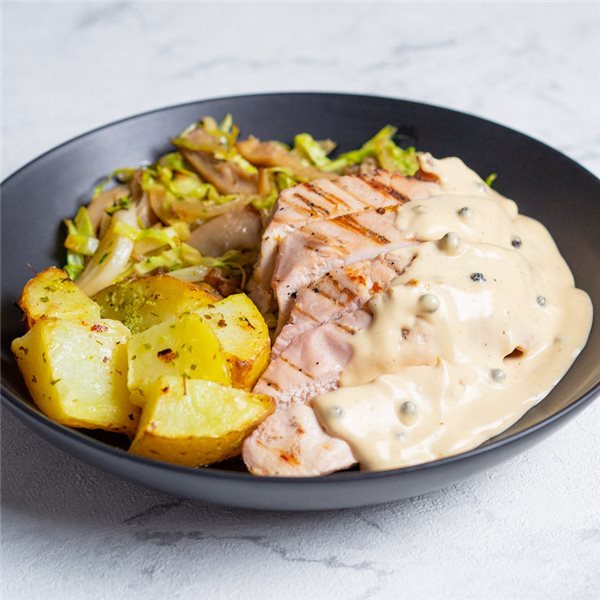 Pechuga de pavo, salsa pimienta (caldo de pollo (agua, pollo, cebolla, aceite de oliva virgen, sal), nata (LÁCTEOS), cebolla, caldo ternera (agua, grasa de ternera, extracto de ternera, caldo de hueso de ternera, sal, aroma natural, extracto de levadura, azúcar, almidón de maíz, zumo concentrado de setas, jarabe de caramelo de azúcar, maltodextrina (patata, tapioca), dextrosa cultivada, pimienta negra), coñac, pimienta verde, aceite de oliva, almidón de maíz, sal, pimienta negra), patata, col, cebolla, seta de cardo, ajo, aceite de oliva virgen, romero, sal, pimienta negra. *Este plato puede contener trazas de apio, sulfitos, gluten, frutos secos y/o pescado otro alérgeno a través de contaminación cruzada, ya que todos nuestros platos se elaboran en el mismo obrador.